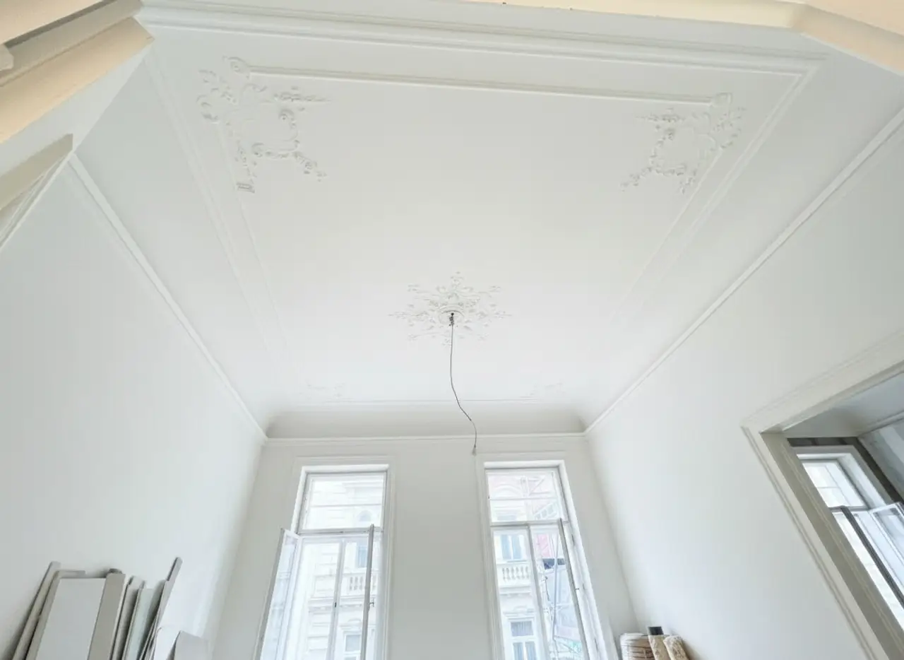 Beim Betreten der Wohnung erkennt man den Charme der alten Zeiten; großzügige Wohnräume mit Stuckdecken, Deckenhöhe mit ca. 3,80 Meter.