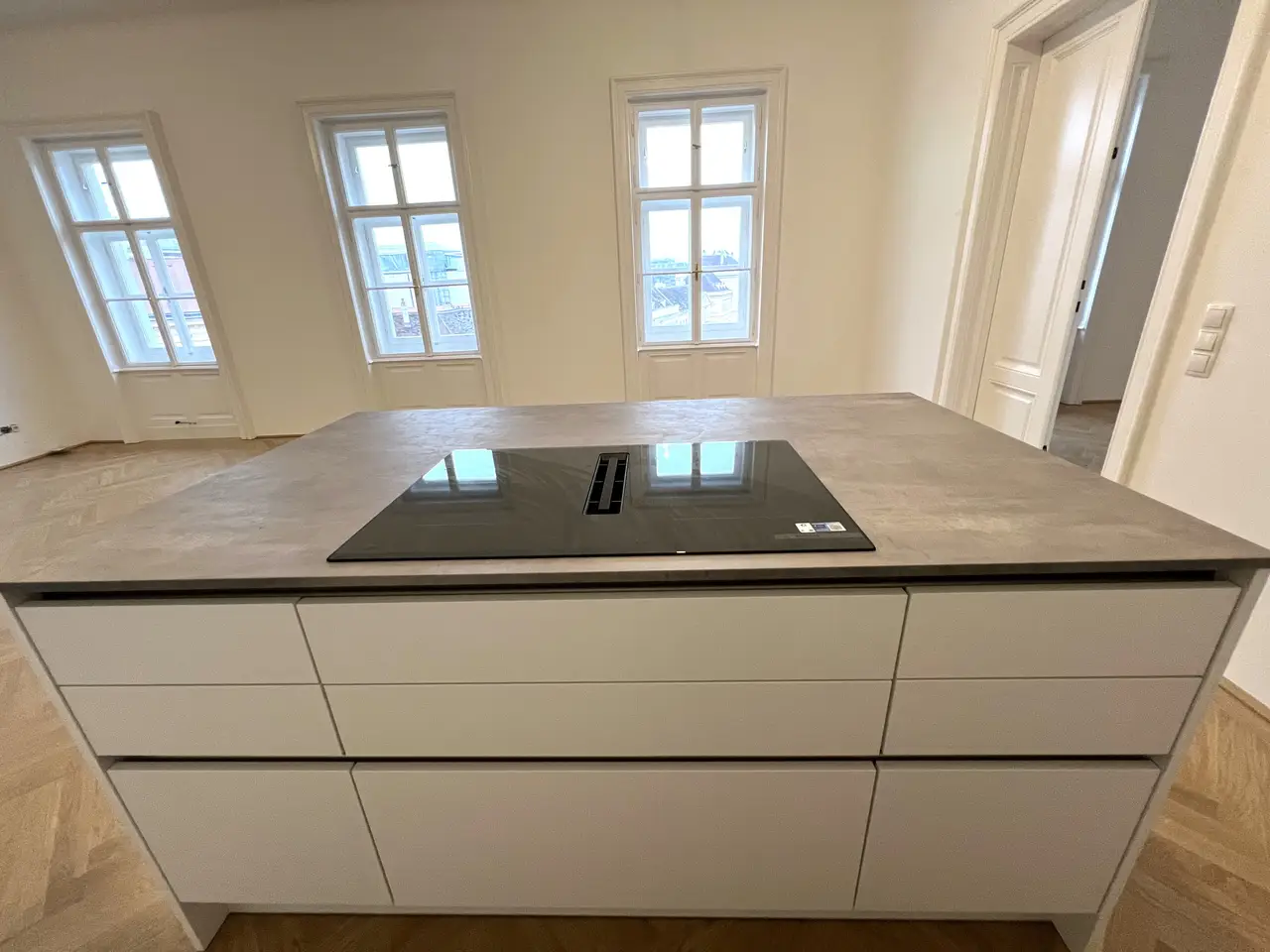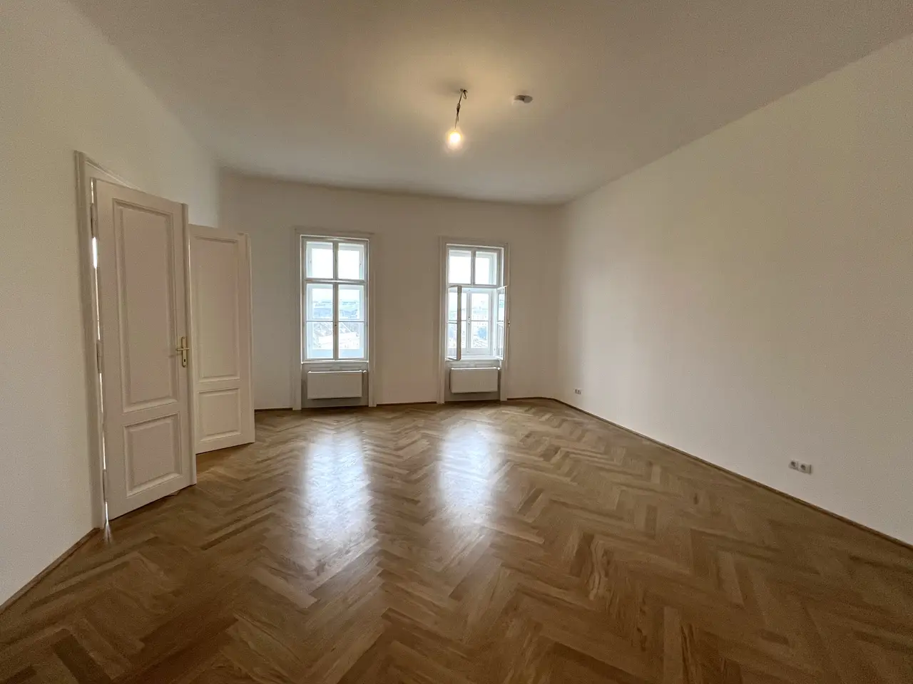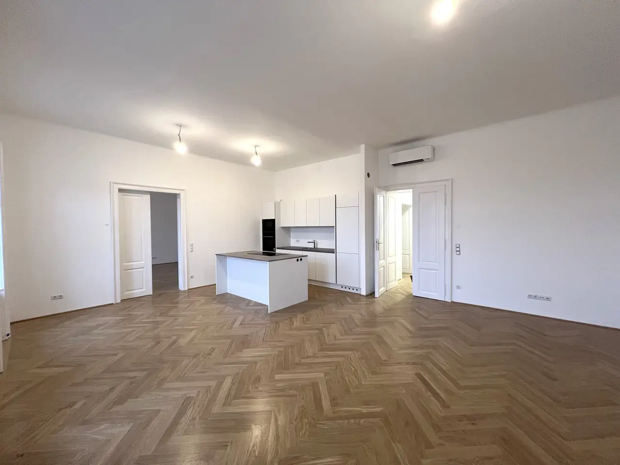 Approximately 3.40-metre-high ceilings, high-quality parquet floors, impressive old-style double doors, spacious rooms, a new kitchen and much more create an elegant atmosphere.
