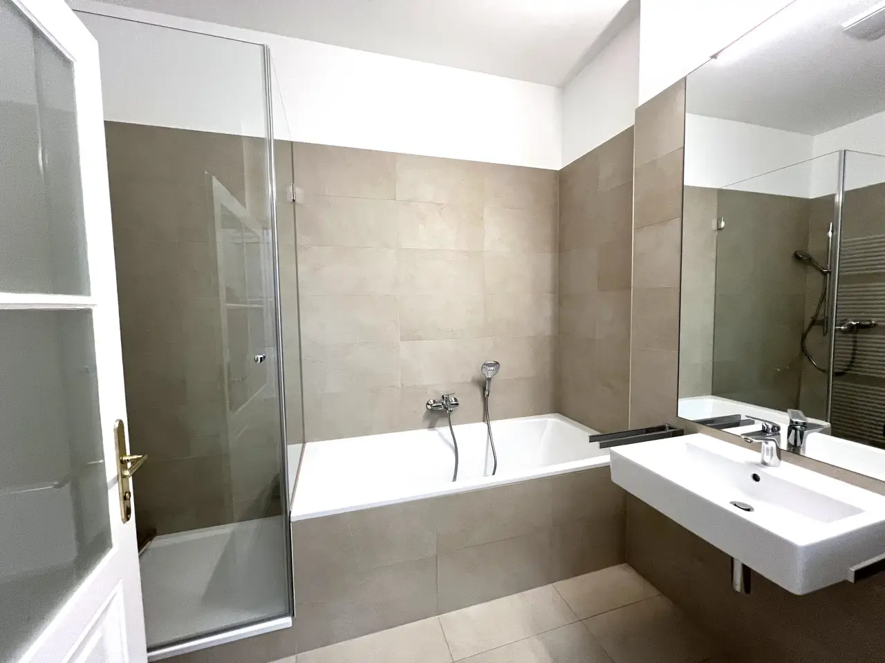 - Badezimmer mit Badewanne, Dusche, Waschbecken und Spiegel, Waschmaschinenanschlüsse