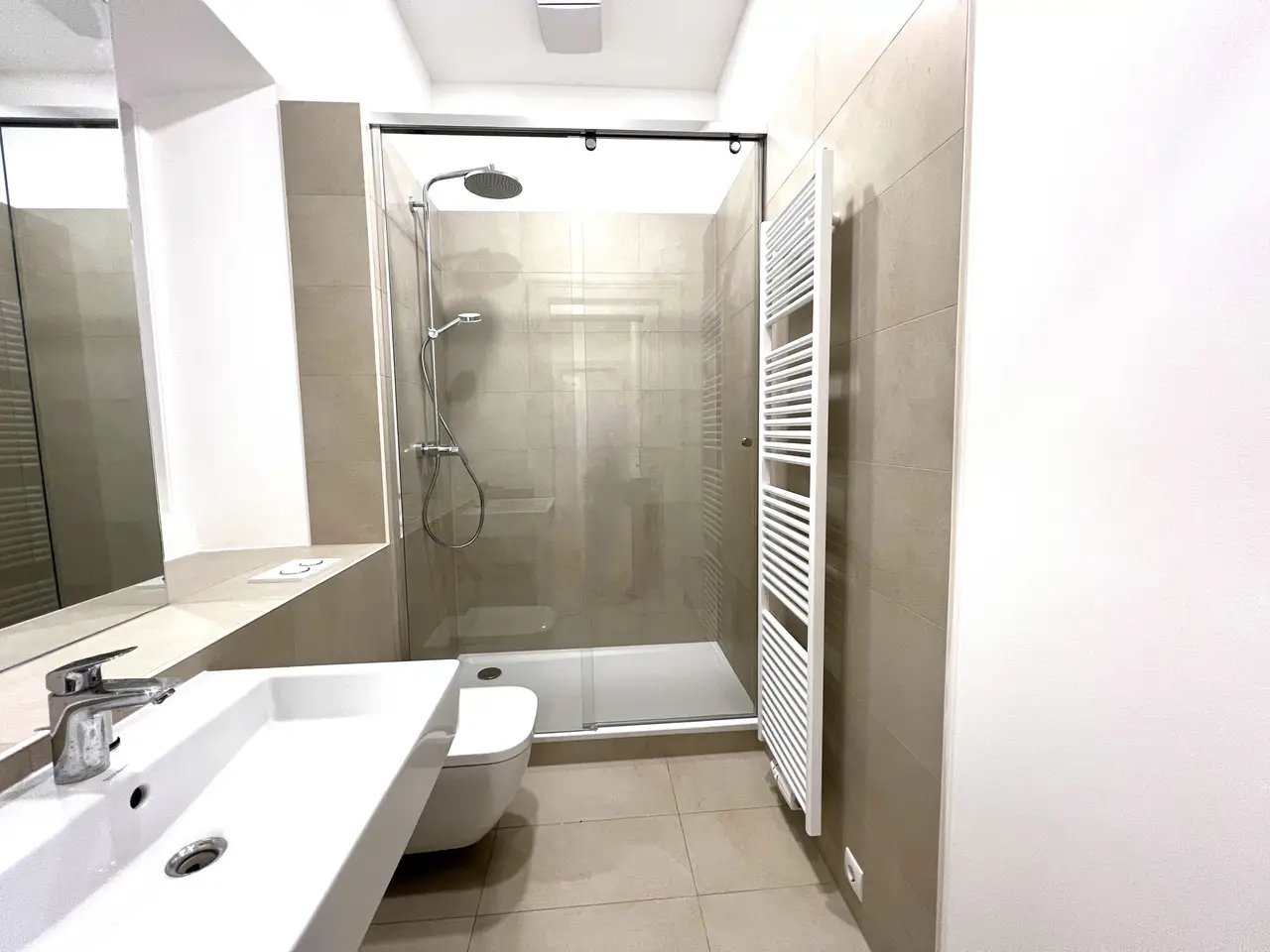 - Bathroom with shower, washbasin and mirror, toilet