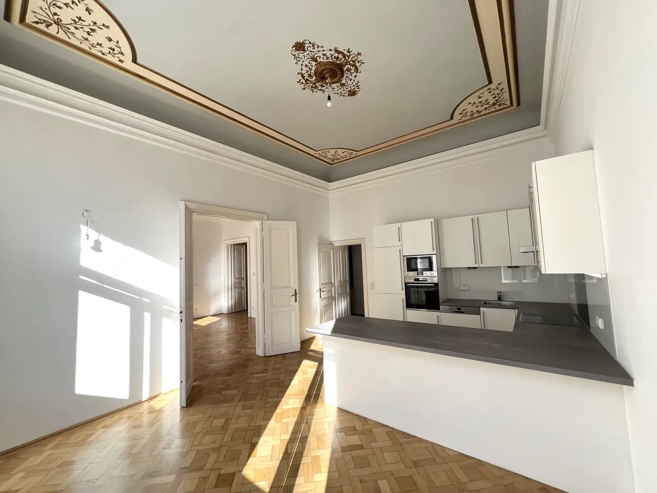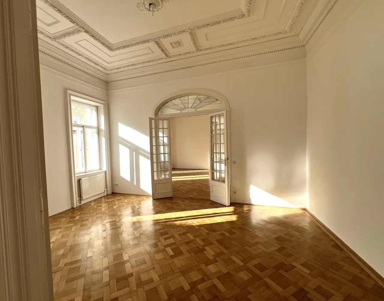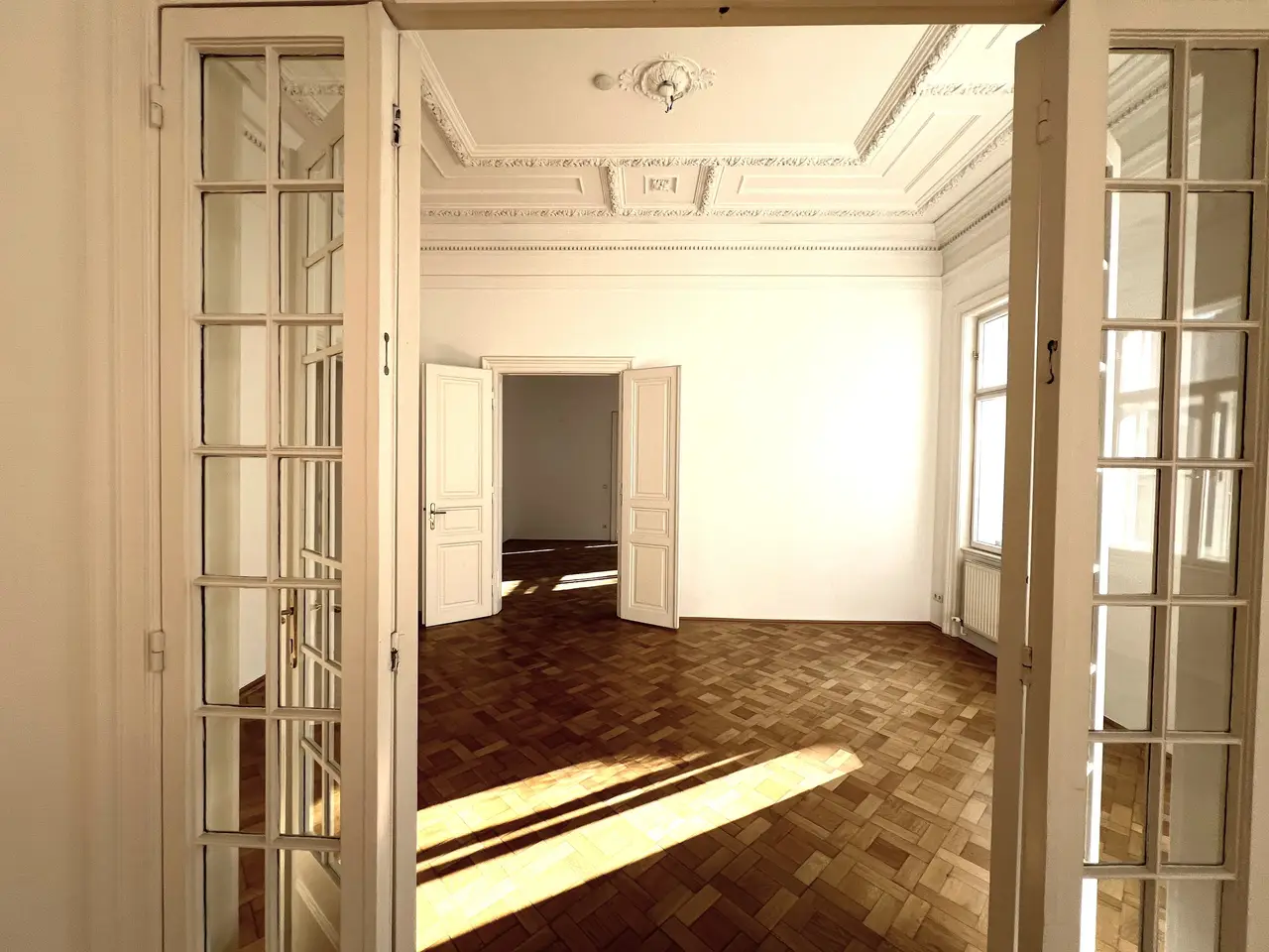 you are greeted by the graceful beauty of the historic rooms with their elaborate ceiling stucco and a ceiling height of almost 4 metres, an inviting entrance hall, the good old traditional doors and much more.