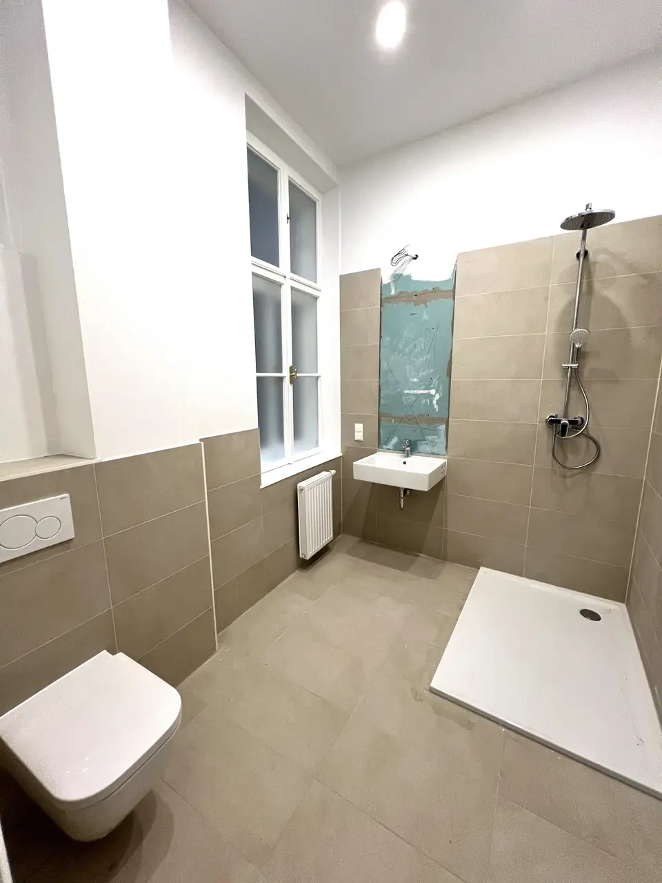 - Badezimmer mit Dusche, Waschbecken, WM-Anschlüsse