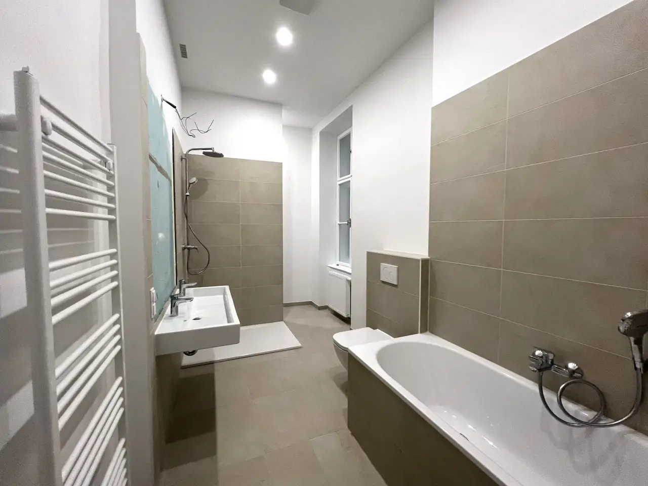 - Badezimmer mit Badewanne, Walk-In-Dusche, WC, Doppelwaschbecken mit Spiegel