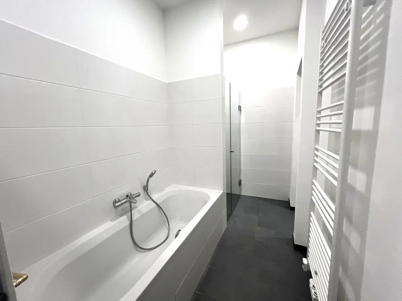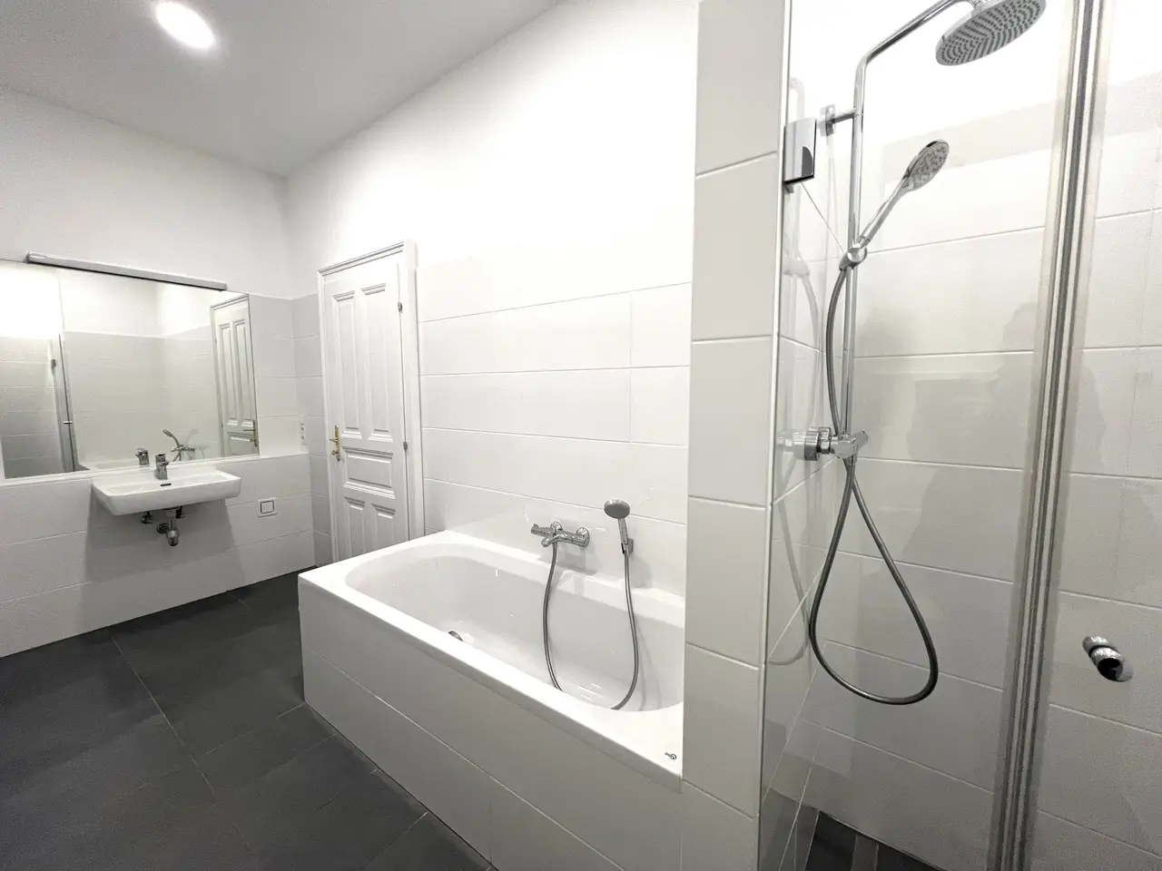 - Badezimmer mit Dusche, Badewanne, Toilette, Waschbecken mit großem Spiegel, WM-Anschlüsse