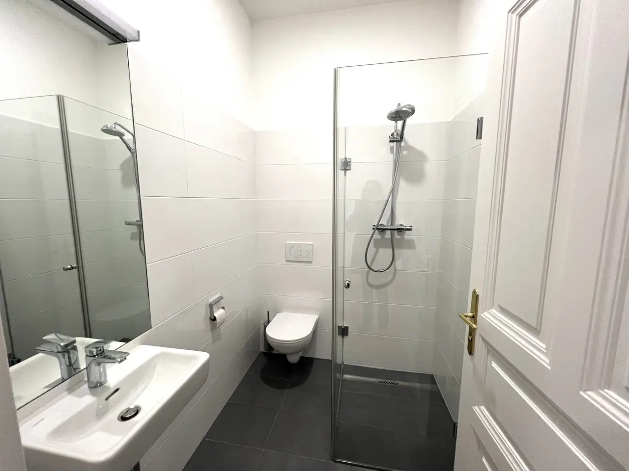 - Badezimmer mit Dusche, Toilette und Waschbecken