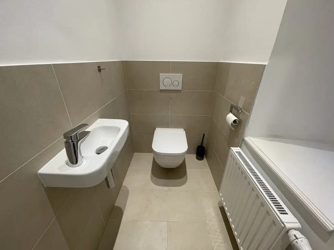 - Gästetoilette mit Waschbecken, Einbauschrank und Fenster