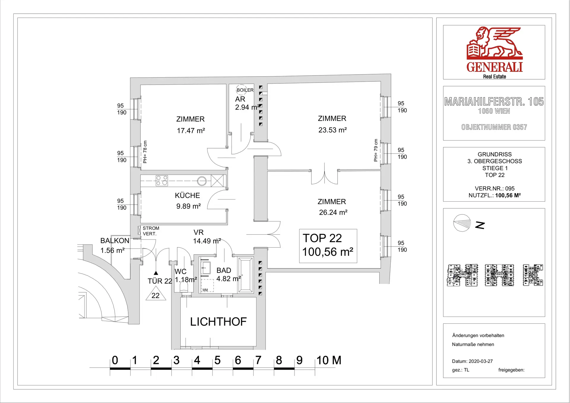 Die gegenständliche Wohnung ist ca. 100 m² groß, verfügt über 3 Zimmer und einen kleinen Balkon und befindet sich in gutem Zustand.