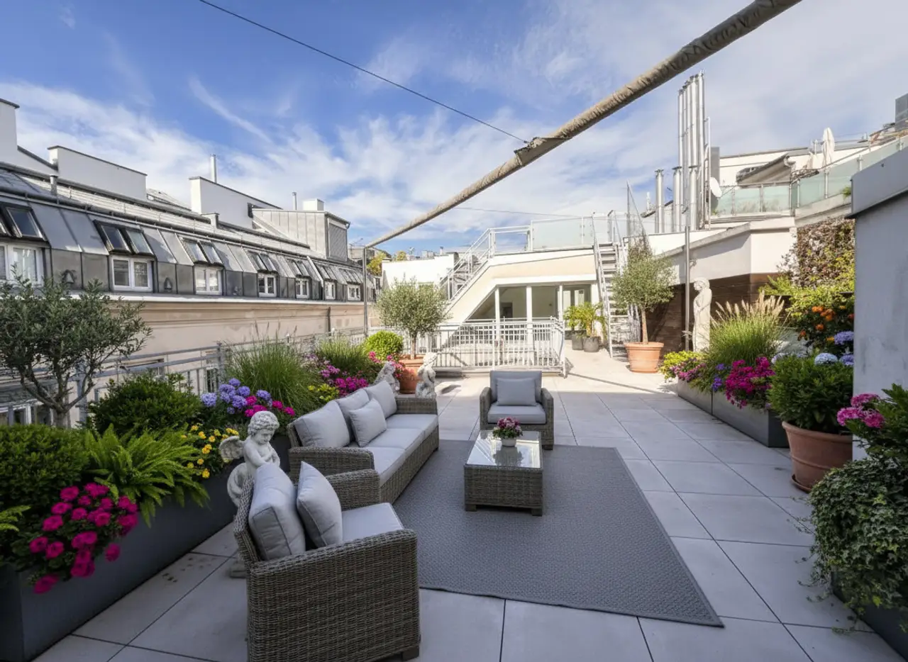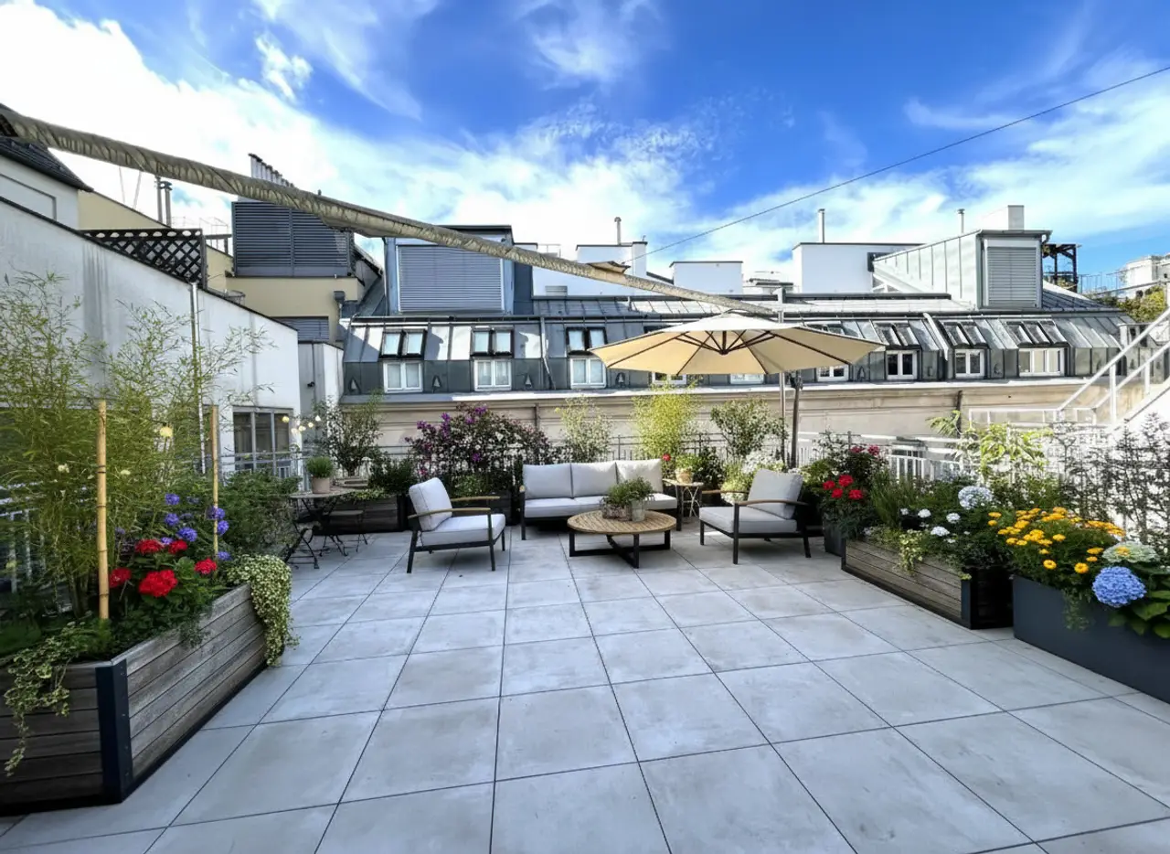 Terraces of this size are a rarity in the city centre. It has a connection for irrigation and opens up many design ideas for transforming this open-air living room into a flowery oasis of well-being.