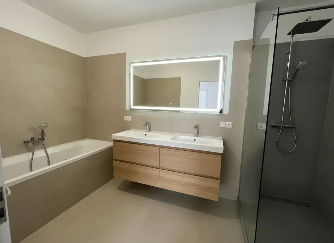 - Bad mit Badewanne, Dusche, Doppelwaschbecken und Toilette
